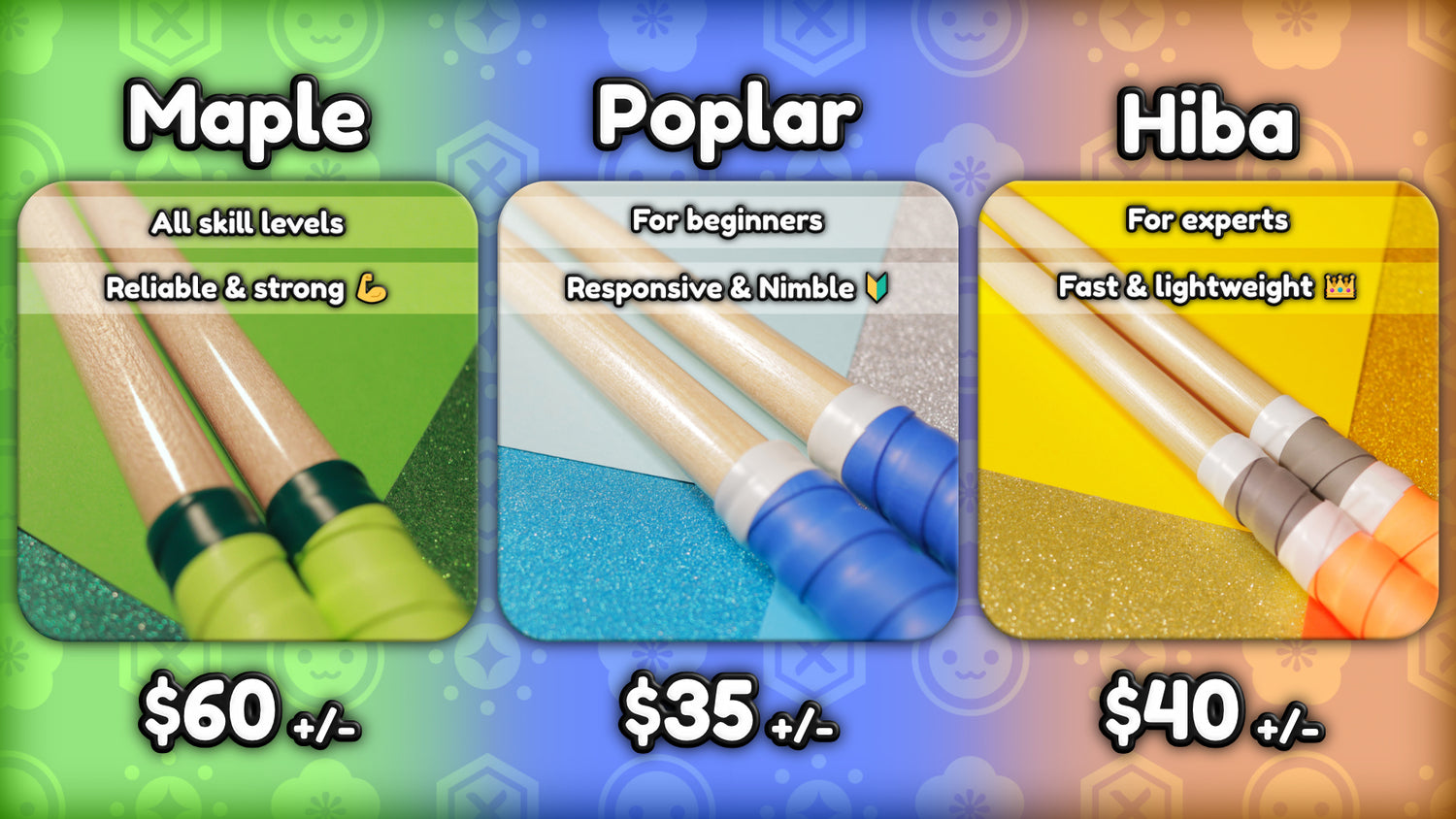 Hiba bachi are the lightest wood you can use on your Taiko journey, making it easy to manipulate by any and all skill levels. If you have sensitive hands Hiba bachi would be a great choice.